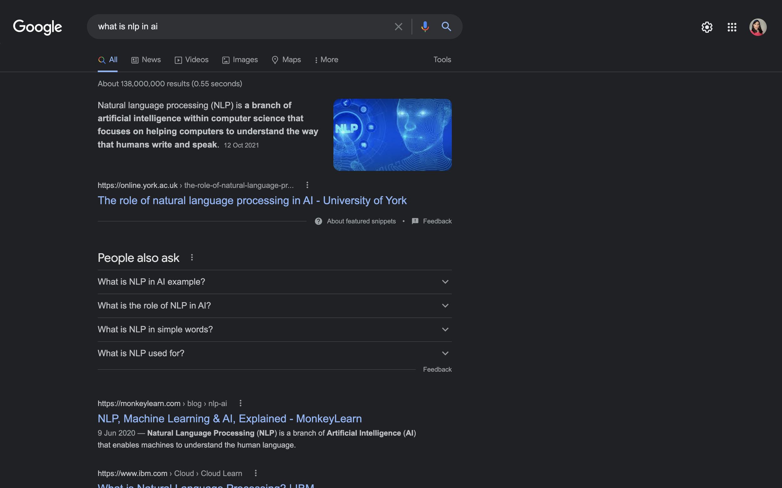 Writing optimised articles for universities up and down the country and across the world like the one below on Natural Language Processing, which takes the top ranking spot in Google searches (“AI” + “NLP”). It also regularly appears in the Google news feed of those interested in artificial intelligence.